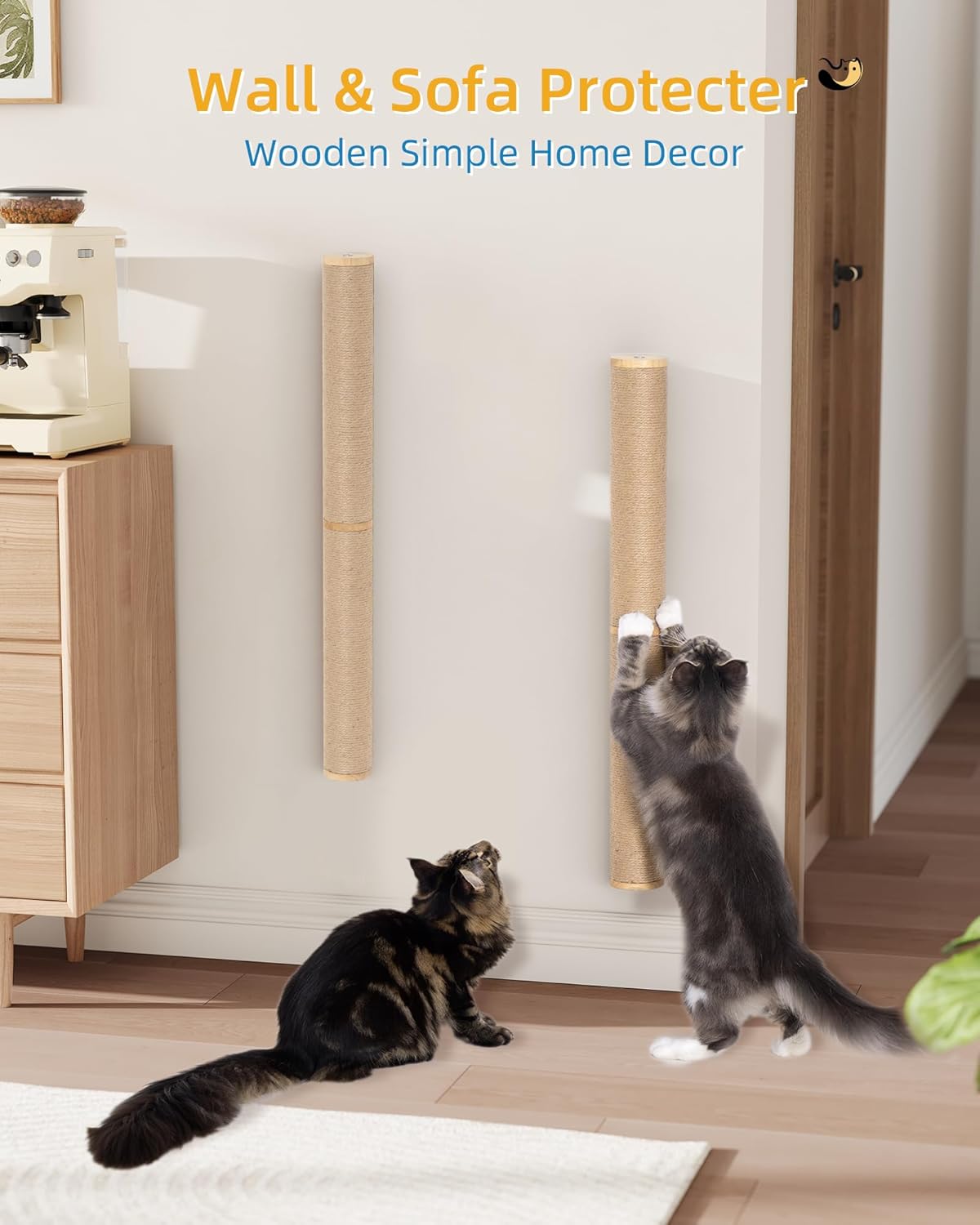 - Decorative & Functional: The two ends and the center of this wall-mounted cat scratcher are crafted from natural rubber wood, this wall cat scratcher adds a touch of elegance while protecting your cat’s paws from metal connectors